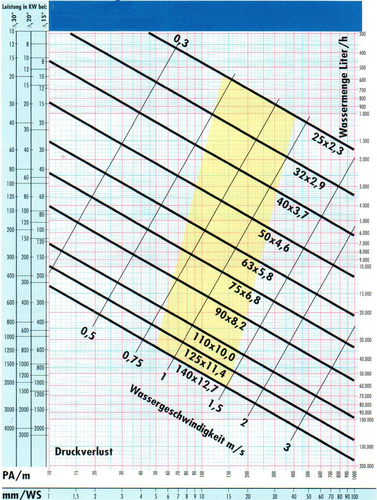 Zunächst sollte also überlegt werden, wieviel Wärme am Ziel benötigt wird und wie gross voraussichtlich die Temperaturspreizung sein wird. Damit kann man aus dem Diagramm unten ersehen, welche Rohrdimensionen in Frage kommen. Ausserdem kann mit Hilfe dieses Diagramms dann die richtige Pumpe gewählt werden.